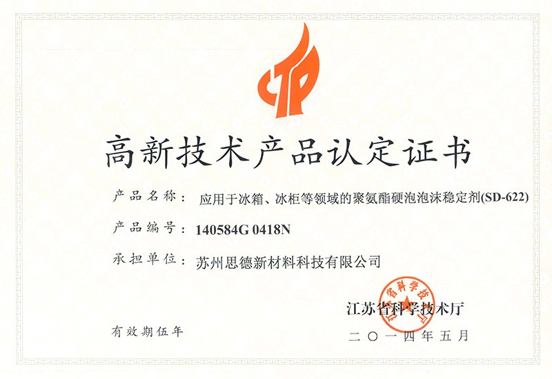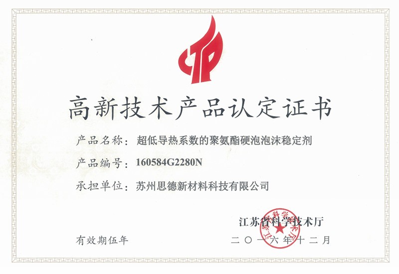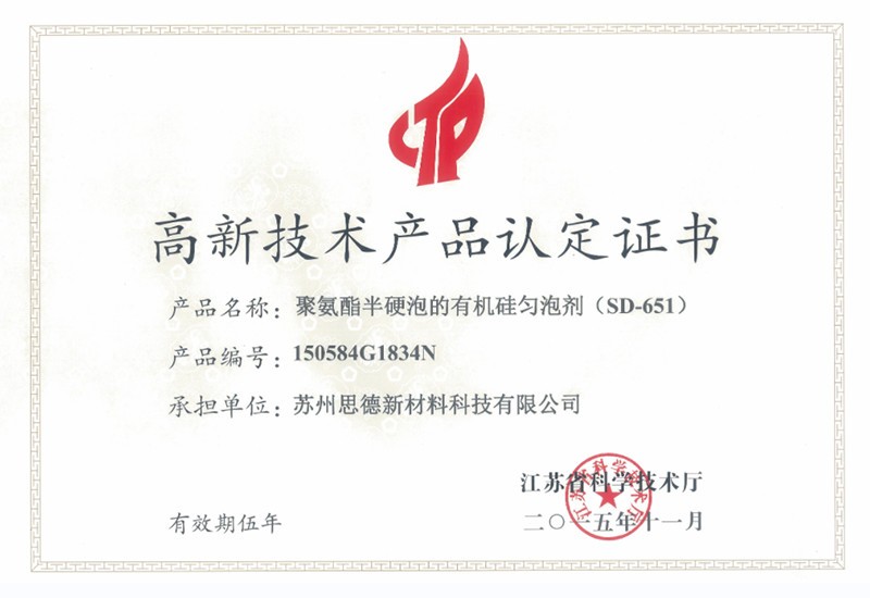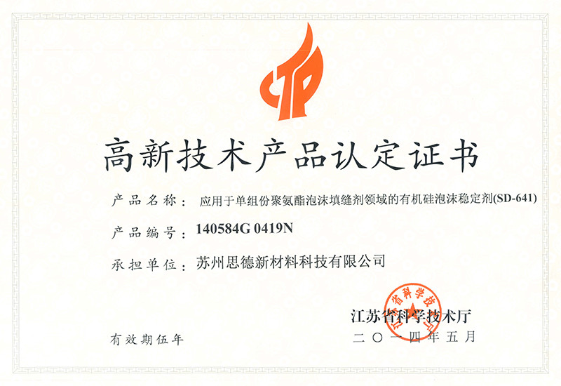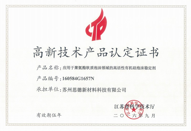 公司目前在售产品主要有聚氨酯硬泡用有机硅泡沫稳定剂系列产品、聚氨酯软泡用有机硅泡沫稳定剂系列产品、聚氨酯OCF用有机硅泡沫稳定剂系列产品、聚氨酯高回弹用有机硅泡沫稳定剂系列产品、聚氨酯慢回弹用有机硅泡沫稳定剂系列产品,其中有20多个产品被认定为江苏省高新技术产品。
